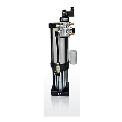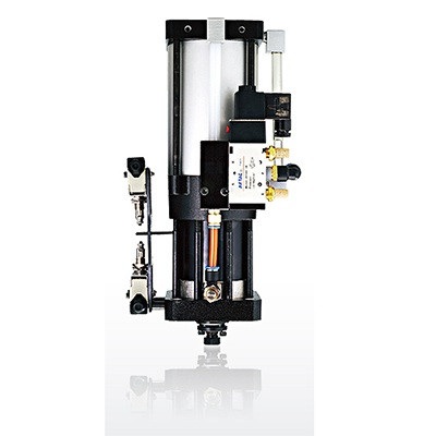 1、預壓式增壓缸:當工作氣壓壓在液壓油表面時,液壓油會因壓縮空氣作用而流向預壓行程腔,此時液壓油會迅速推動軸心作位移,當工作位移遇到的阻力大于氣壓壓力時預壓軸心則停止動作,此時,增壓缸的增壓段因為氣動壓力動作,增壓軸心亦開始作位移動作,并擠壓預壓缸體里的低壓油,使之增壓從而產生強大推力的效果。